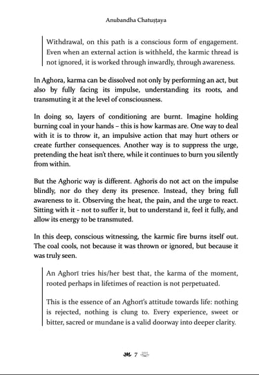 True Sādhanā is the offering of oneself into the mystic fire, to be forged by inner transformation. The greatest tragedy is the decline of true Sādhanā. Aghora is perceived as some shortcut to power through lawlessness and indulgence. One does not walk the path of Sādhanā for experiences, visions, or gains, or to become something. It is a return journey back to the source.