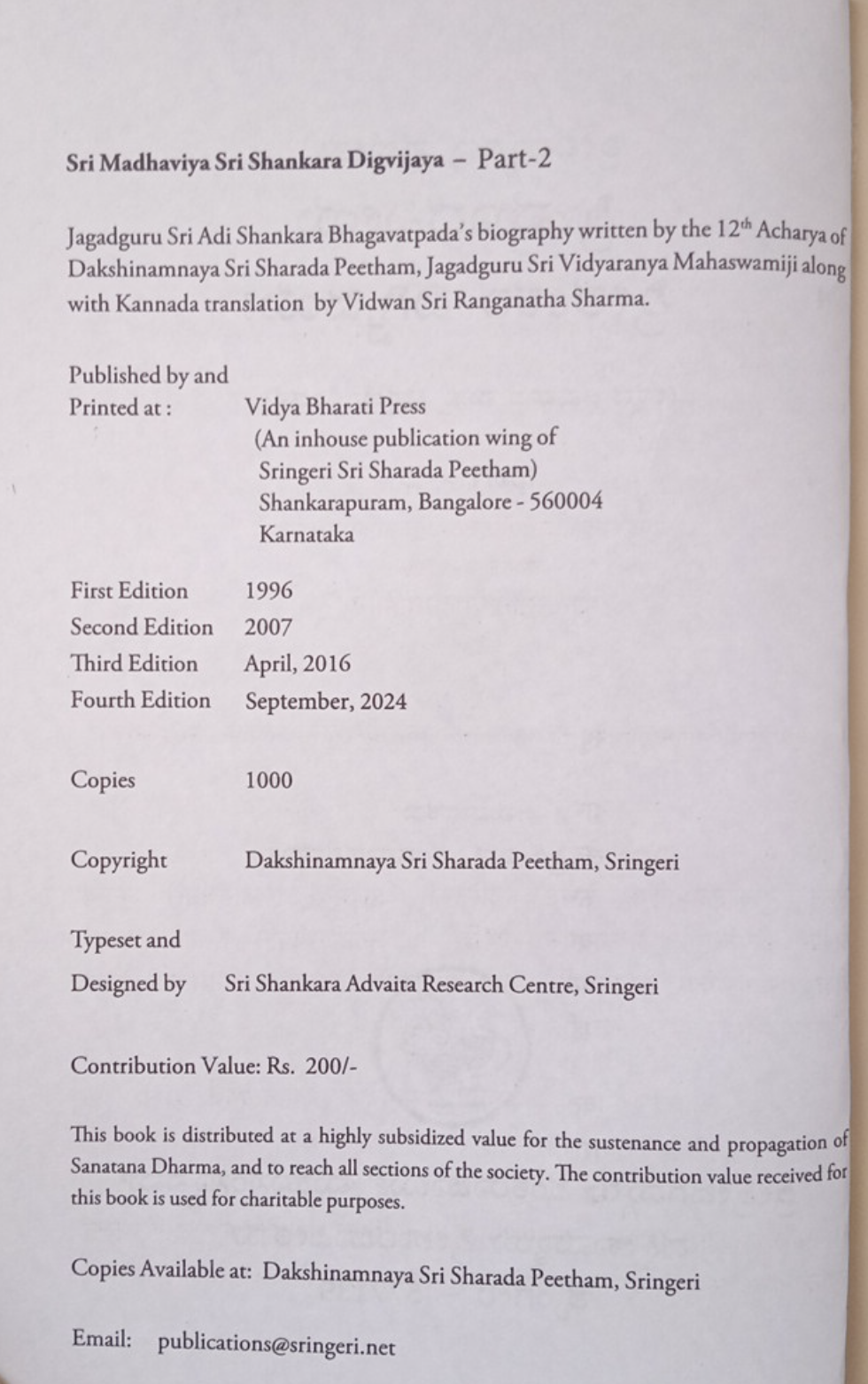 Sri Madhaviya Shankara Digvijaya – Part 2 is the second volume translated in kannada of the esteemed Sanskrit poetic biography of Sri Adi Shankaracharya, traditionally attributed to Sri Vidyaranya, the 12th Jagadguru of the Sringeri Sharada Peetham. This work offers a detailed account of Adi Shankaracharya's life, teachings, and spiritual conquests across India.